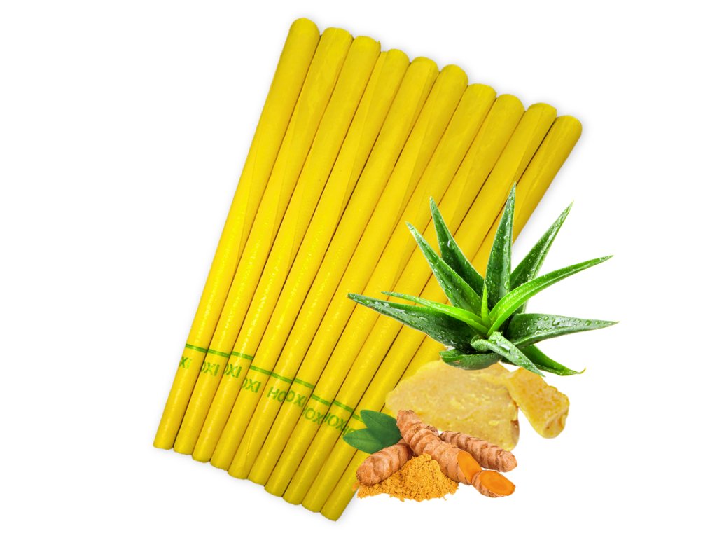 Volně balené tělové svíce HOXI® s ALOE VERA jsou zhotoveny s láskou a péčí z 100% bavlněného plátna, včelího vosku, protizánětlivé kurkumy a esenciálního oleje Aloe Vera. Kónický tvar a optimalizovaná délka zajišťují maximální efektivitu při používání. Pro vaši bezpečnost je každá svíce HOXI® opatřena ochranným filtrem z gázy.