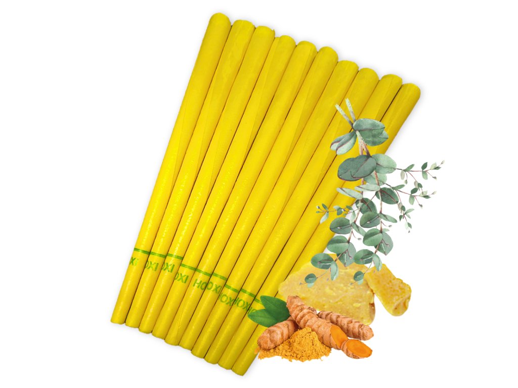 Volně balené tělové svíce HOXI® s EUCALYPTEM jsou vyrobeny v České republice z 100% bavlněného plátna, včelího vosku, esenciálního oleje Eucalyptus a protizánětlivé kurkumy. Každá svíce je originálem ruční výroby, má kónický tvar s optimalizovanou délkou a ochranný filtr z gázy pro maximální bezpečnost a efekt.