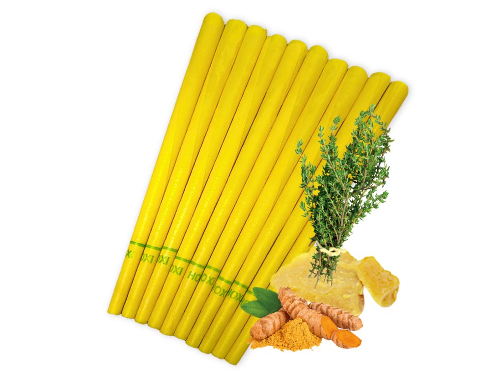 Volně balené tělové svíce HOXI® s tymiánem jsou vyrobeny ručně s láskou a důrazem na kvalitu. K jejich výrobě používáme 100% bavlněné plátno, včelí vosk, esenciální olej tymiánu a protizánětlivou kurkumu. Tymián je známý pro své léčivé vlastnosti a blahodárné účinky na lidské zdraví. Tělové svíce HOXI® s tymiánem tak spojují tradiční recepturu s benefity této bylinky. Tělové svíčky HOXI® s tymiánem mají kónický tvar a optimalizovanou délku pro dosažení co nejlepšího efektu. Každá svíce je opatřena ochranným filtrem z gázy pro maximální bezpečnost a komfort při používání.