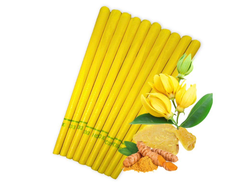 Tělové svíce HOXI® YLANG YLANG - volně balené. Ručně vyráběné, s protizánětlivou kurkumou a esenciálním olejem Ylang Ylang. Tělové svíce HOXI® Ylang Ylang se pyšní ruční výrobou ze 100% bavlněného plátna, včelího vosku a protizánětlivé kurkumy. Díky kónickému tvaru a optimalizované délce dosahují svíce maximální účinnosti. Pro Vaši bezpečnost je každá svíce opatřena ochranným filtrem z gázy.