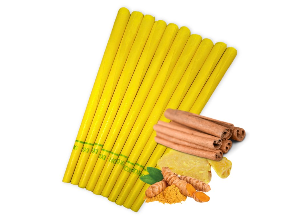 Volně balené tělové svíce HOXI® se SKOŘICÍ jsou ručně vyráběné z přírodních surovin – včelího vosku, kurkumy a esenciálního oleje skořice. Svíce mají kónický tvar, optimalizovanou délku, ochranný filtr z gázy a příjemnou vůni skořice. Vhodné pro tradiční podporu trávení, lymfatického systému, úlevu od bolesti a psychickou pohodu.