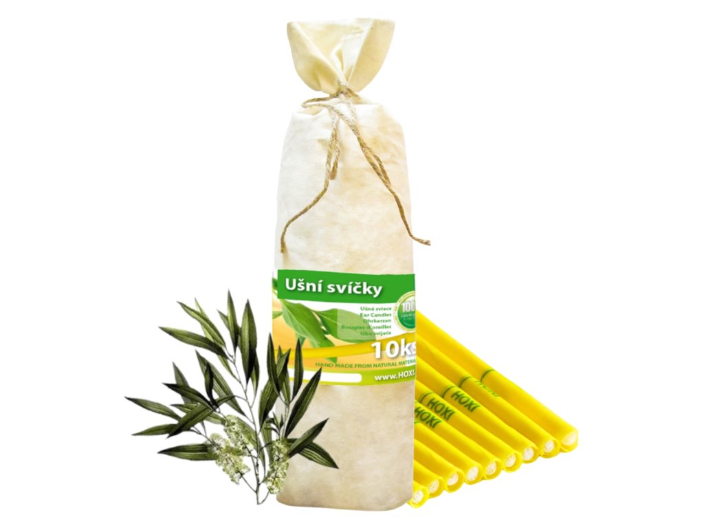 Ušní svíce HOXI® s TEA TREE v plátěném pytlíku jsou vyrobeny ručně ze 100% bavlněného plátna, včelího vosku, protizánětlivé kurkumy a esenciálního oleje z tea tree. Ušní svíce HOXI® s tea tree jsou kónického tvaru s optimalizovanou délkou pro co nejlepší účinnost. Každá ušní svíce HOXI® s tea tree je opatřena ochranným filtrem z gázy. Ušní svíce se používají již po staletí a představují tradiční metodu péče o ušní hygienu.