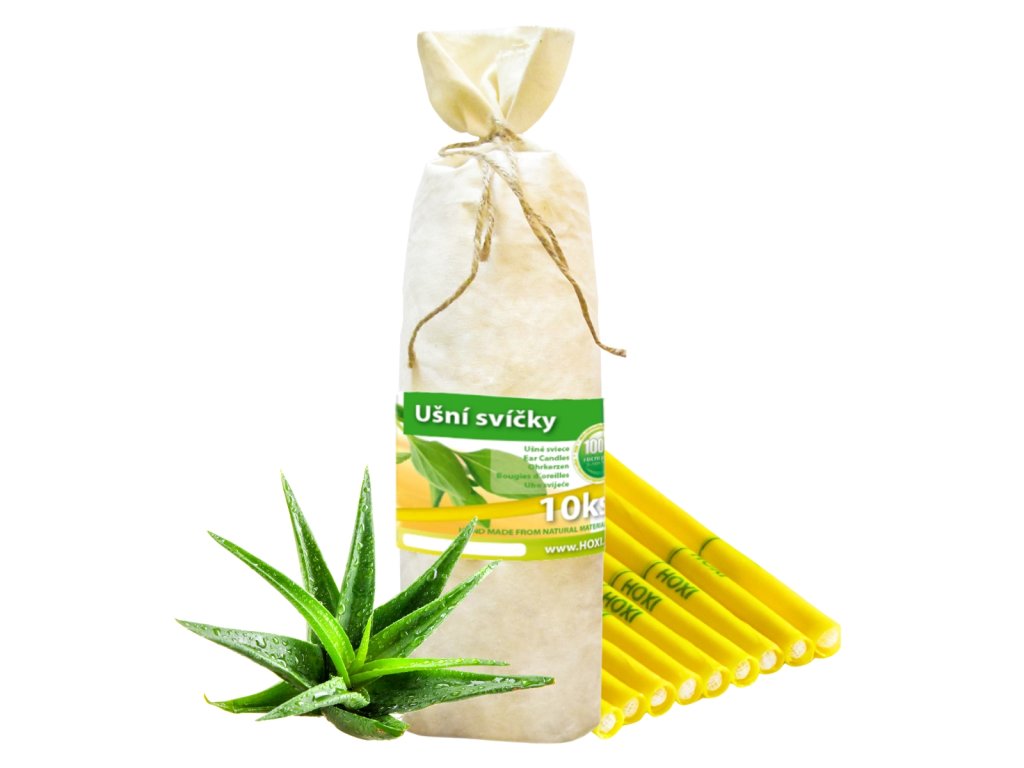 Ušní svíce HOXI® s ALOE VERA v plátěném pytlíku s protizánětlivou kurkumou. Ušní svíce HOXI® s ALOE VERA jsou vyrobeny ručně z přírodních materiálů: 100% bavlněné plátno, Včelí vosk, protizánětlivá kurkuma, esenciální olej z aloe vera. Kónický tvar a optimalizovaná délka zajišťují maximální účinnost. Každá svíčka je opatřena ochranným filtrem z gázy pro větší bezpečnost.