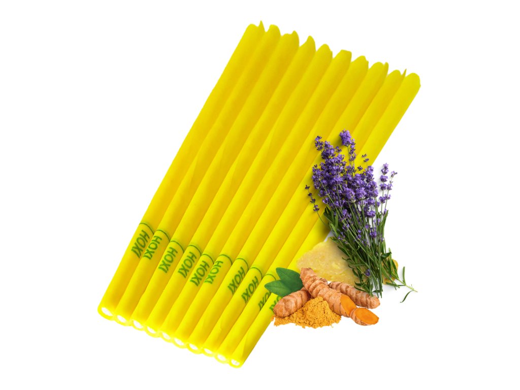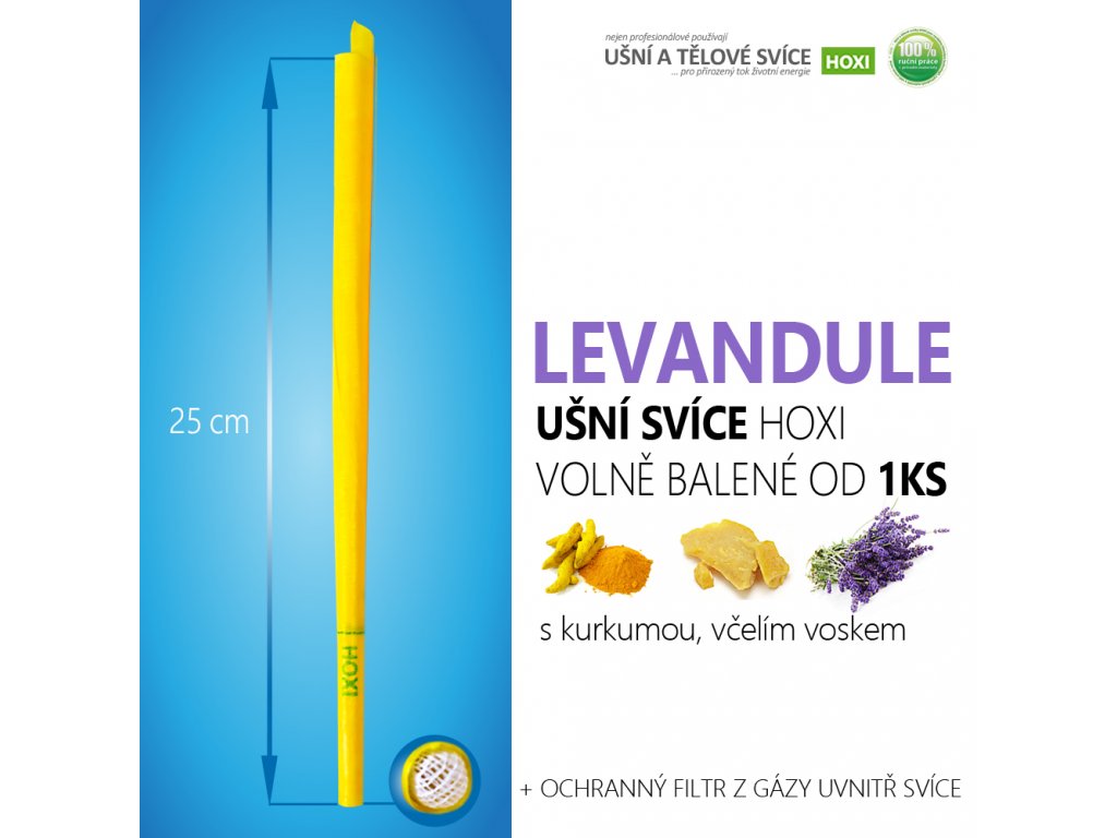 Volně balené ušní svíce HOXI® s levandulí jsou vyrobeny ručně ze 100% bavlněného plátna, včelího vosku, protizánětlivé kurkumy a esenciálního oleje z levandule. Ušní svíce HOXI® s levandulí jsou kónického tvaru s optimalizovanou délkou pro co nejlepší účinnost. Každá ušní svíce HOXI® s levandulí je opatřena ochranným filtrem z gázy.